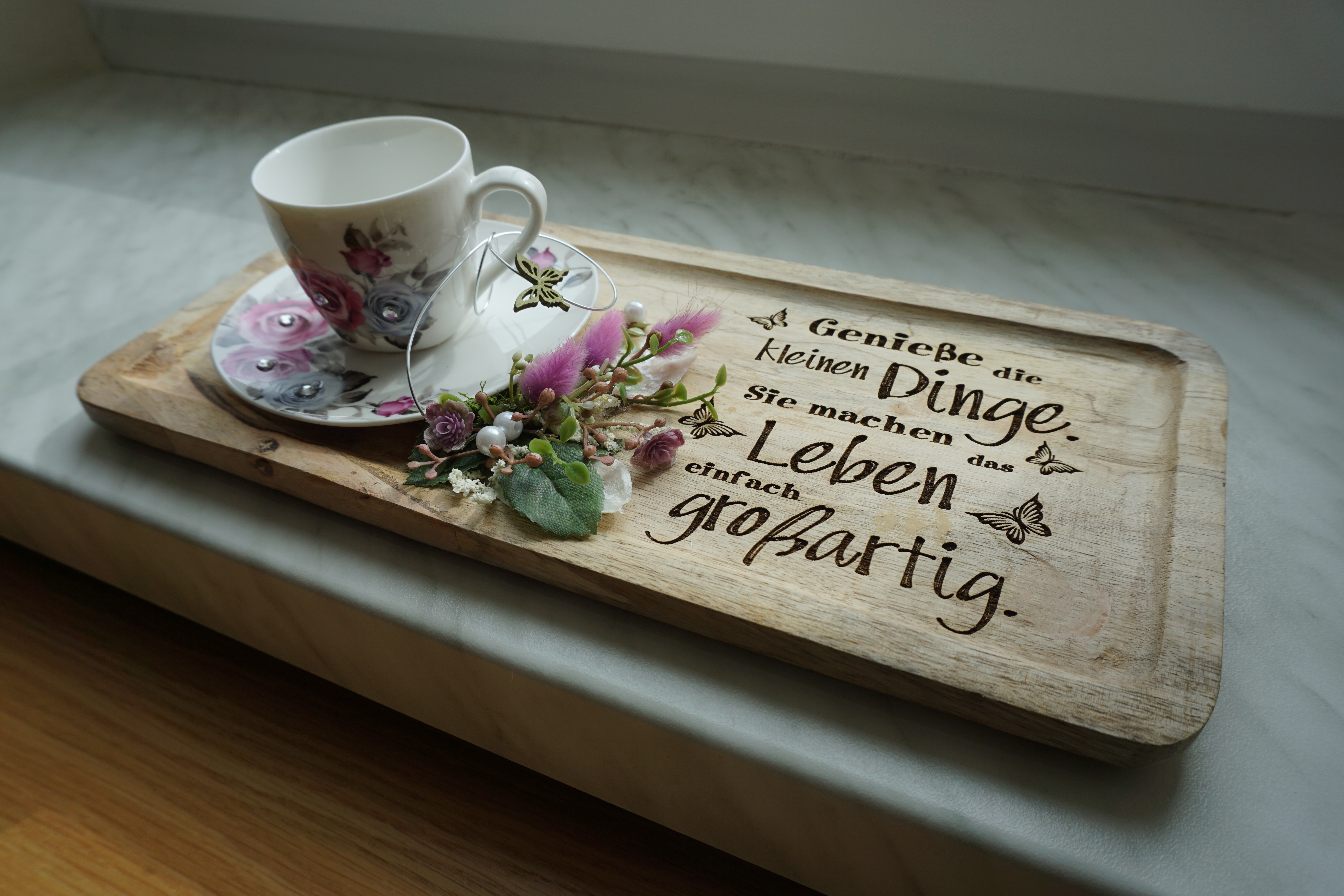 Verschwendung ist Johanna Holzer ganz fremd. So erzählt sie beim Interview, dass sie Kaffeegeschirr bestellt hat. Jedoch kamen Mokkatassen, die für Milchkaffeefans unbrauchbar sind. Kurzerhand hat Johanna die Tassen zu Tischdekorationen umgearbeitet und ein Teelicht eingebaut.