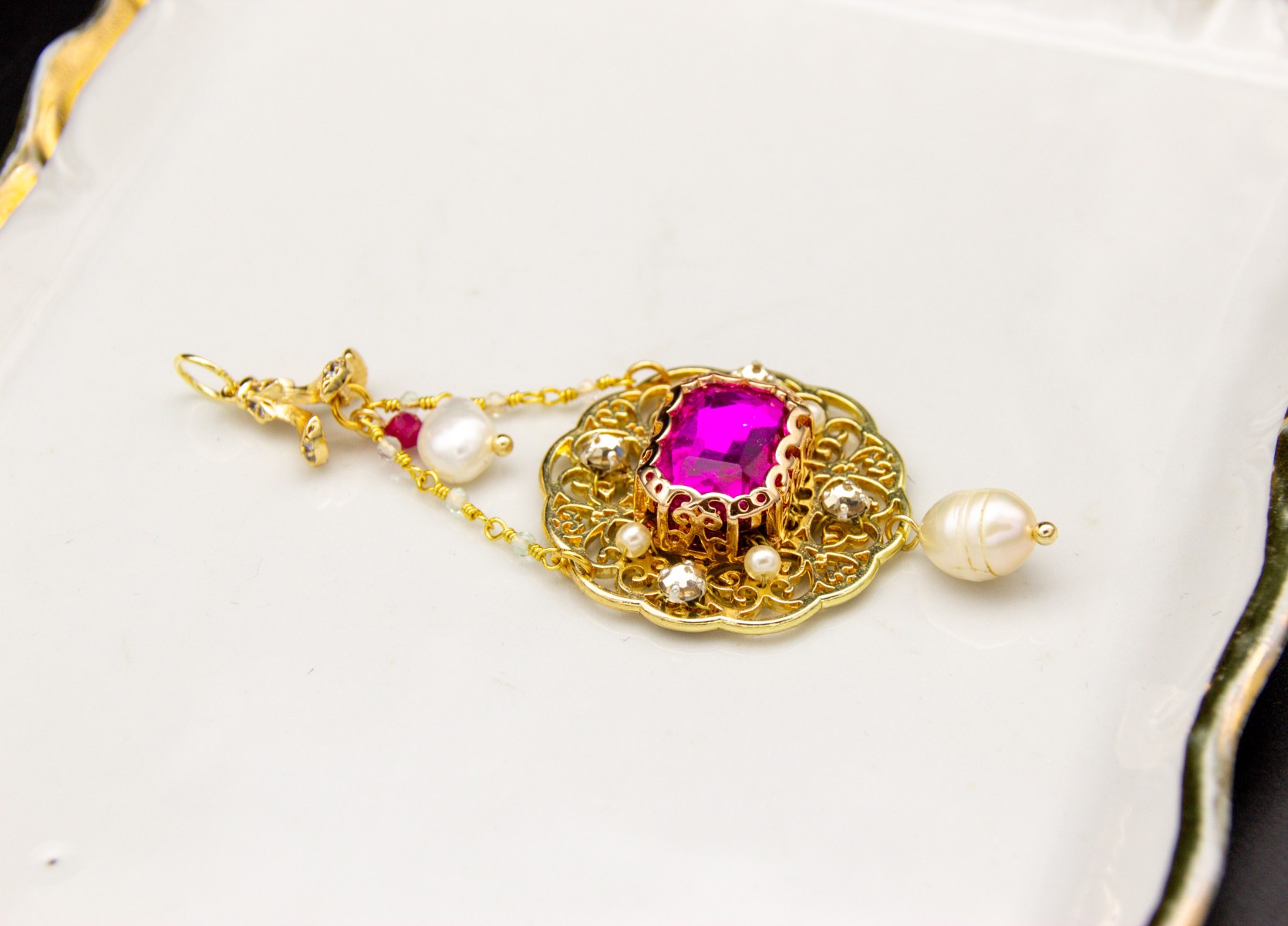 Ein Anhänger in der typischen Form der späten Renaissance bis Barock ~1600 aus zwei Teilen, verbunden durch Kettchen. Die hängenden Perlen sind Süßwasserperlen, die winzingen Perlchen in den Ketten und bei den Perlen sind Quarz, alle anderen sind aus Glas. Die Metallteile sind aus Messing echt vergoldet.