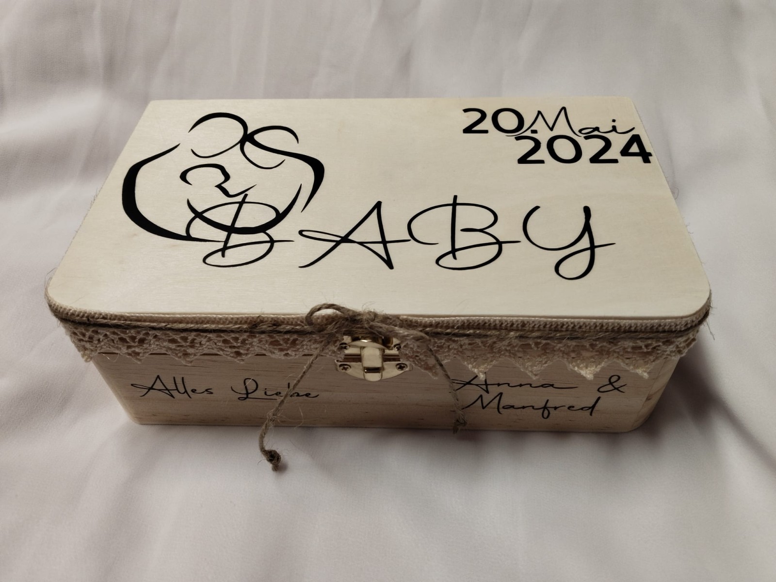 Eine Holzbox Verziert mit den Daten des neugeborenen Wunders und befüllt mit mindestens 4 beschrifteten Artikeln.