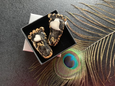 In diesen kleinen Füße sind Erinnerungen eingearbeitet wie zB Muttermilch, Nabelschnurstücken, erste Fußabdruck, Häärchen, Initialen, Daten zum Kind