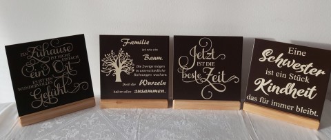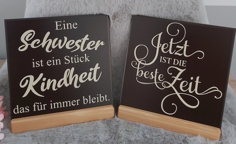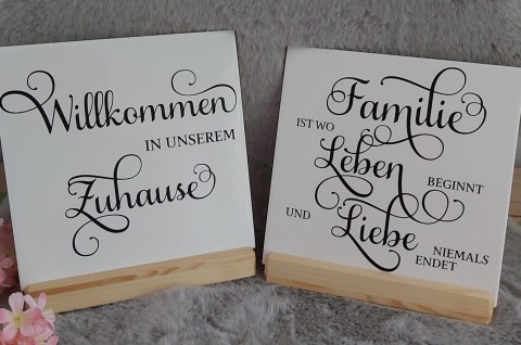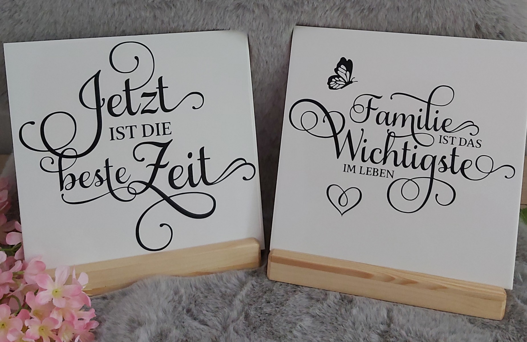 Wandfliese 20x20 cm mit schönem Spruch im Holzständer Farbe: weiß oder braun Spruch wird aus Vinylfolie aufgeklebt