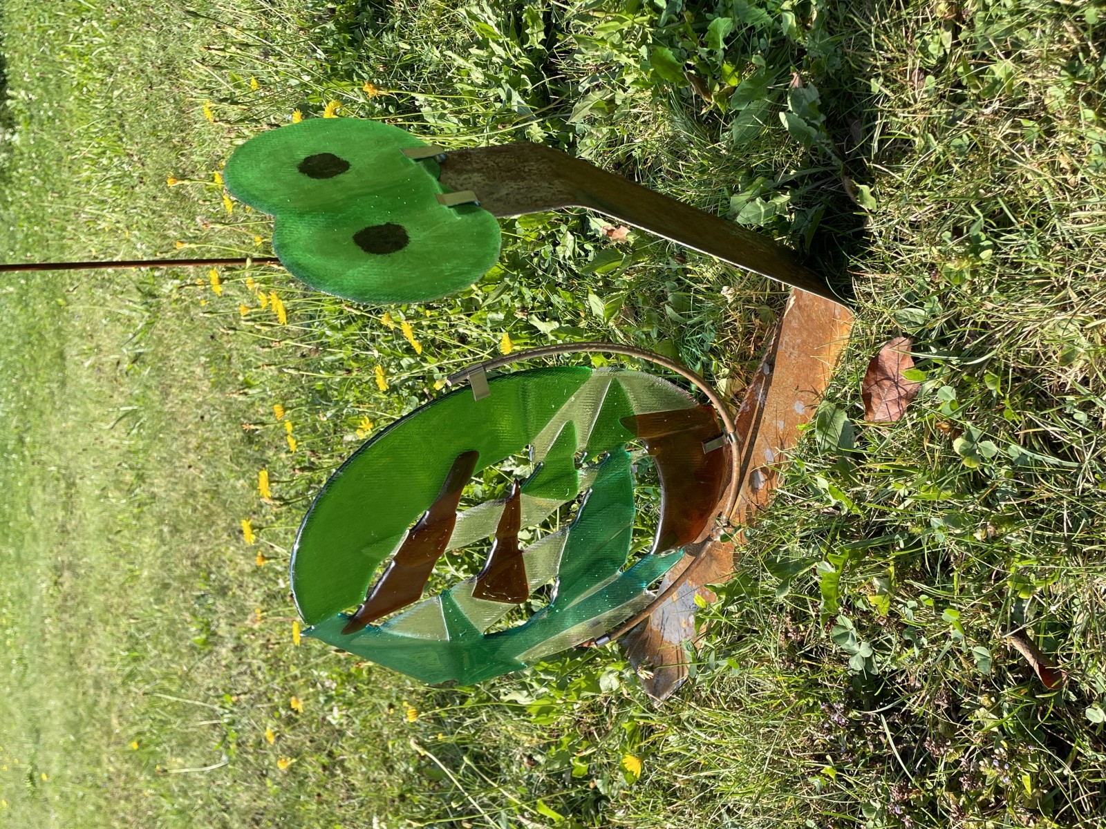 Die Glasscheiben sind auf einem Eisenständer montiert. Sie können dieses Prachtstück ganzjährig im Garten bewundern. Ca. 40cm hoch, 50cm lang.