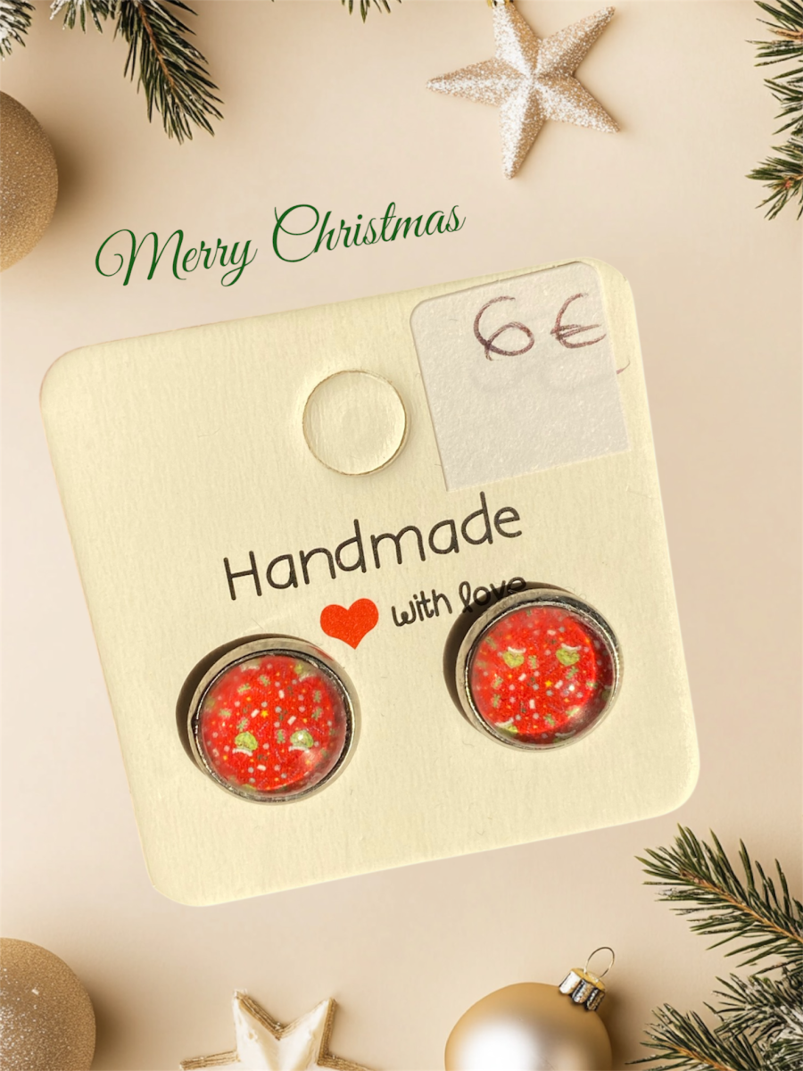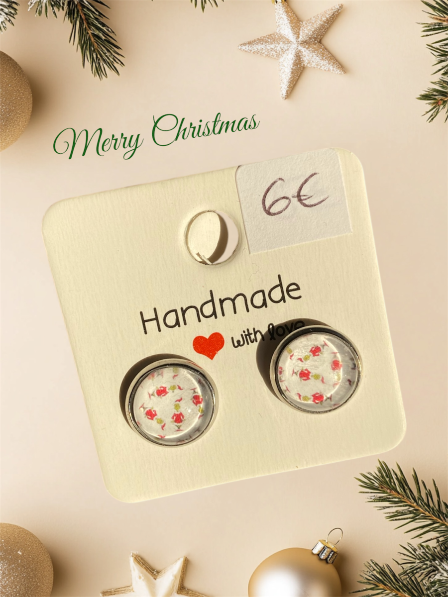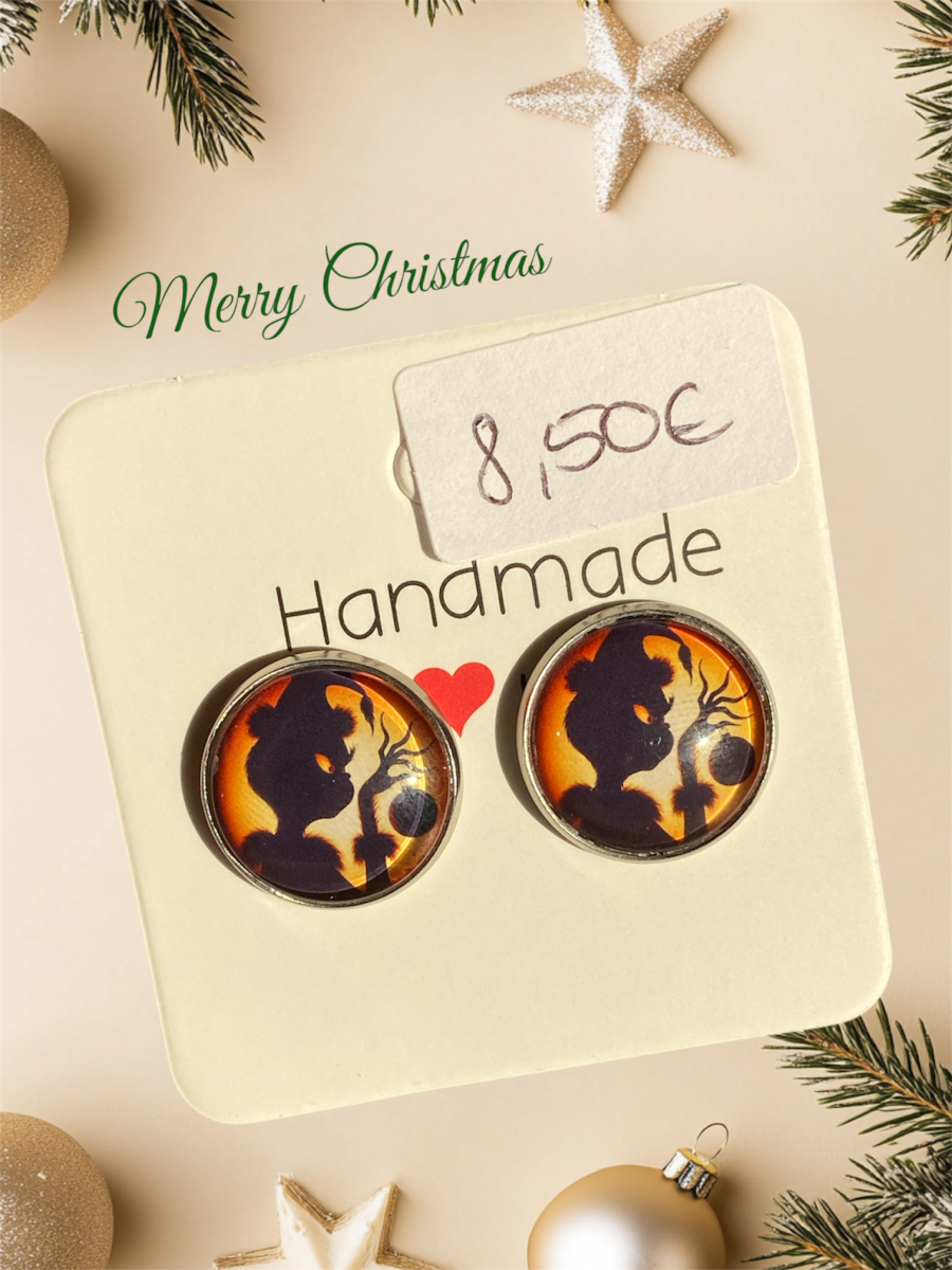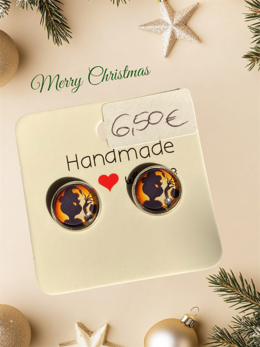 Unterschiedliche Ohrstecker in Edelstahlfassungen mit individuellen Motiven hinter wunderschön geschliffenen Cabochongläser.