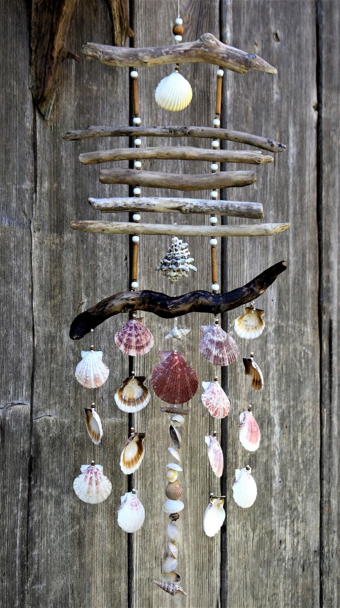 - Muscheln in verschiedenen Größen, geschmückt mit braunen und weißen Holzperlen sowie weißen Rocailles