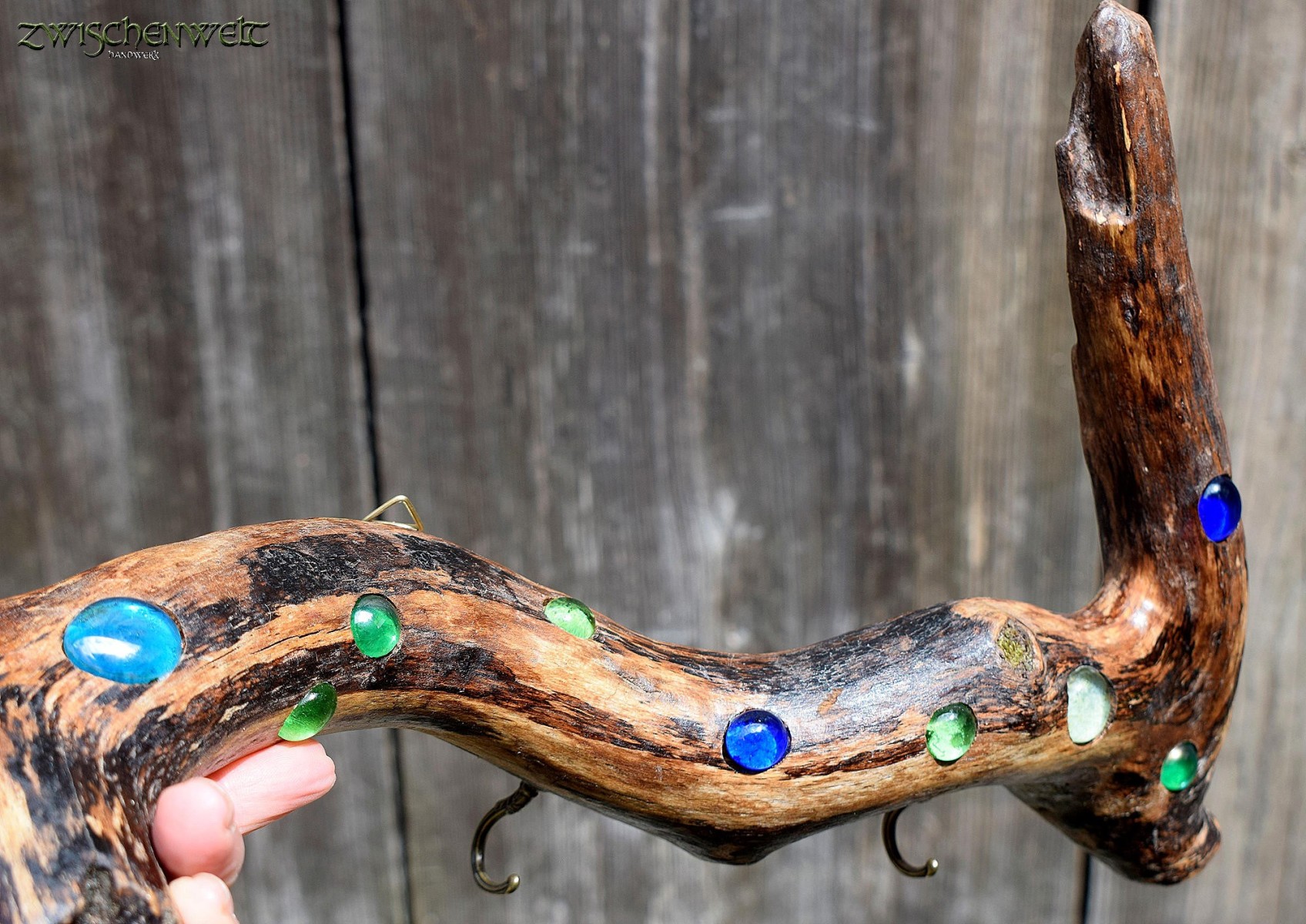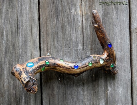 Hakenboard aus Treibholz mit bunten Glassteinen - für Schlüssel, Küchenaccessoires, Schmuck oder sonstige Kleinutensilien geeignet