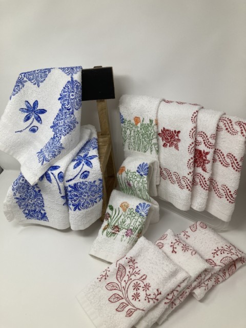 Bedruckt bzw. appliziert werden Leinen- und Baumwollstoffe, Seide, Filz, Jute, Papier, Karton aber auch Vintage-Trägermaterialien wie handgewebtes Bauernleinen, u.v.m.