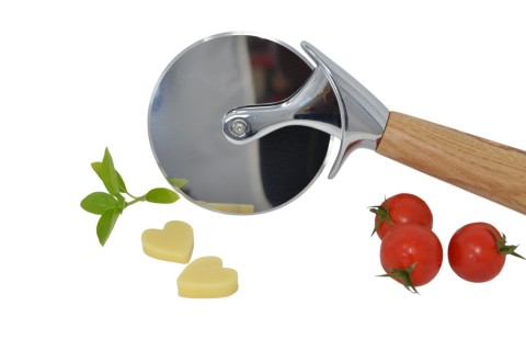 Handgefertigte Pizzaschneider aus Edelstahl mit edlem Holzgriff.