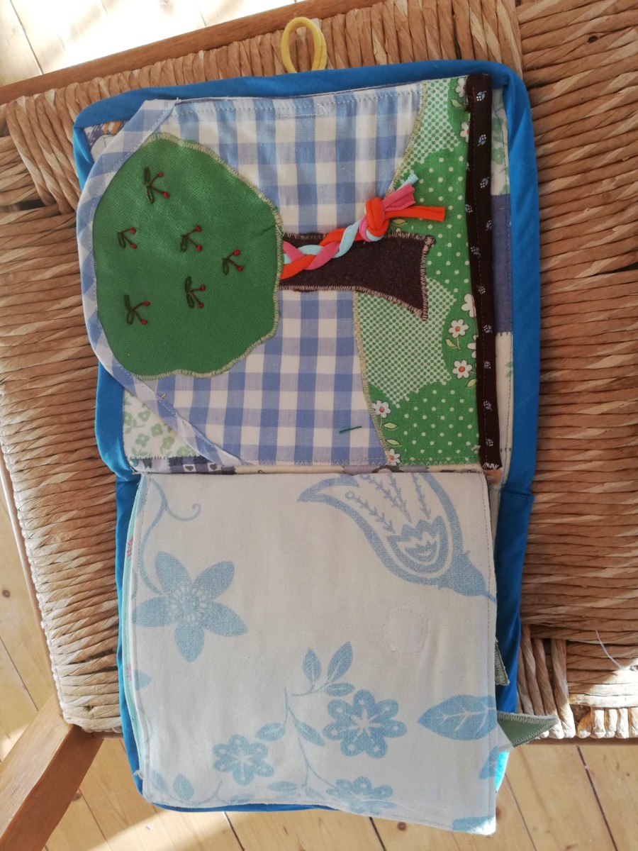 Das Buch ist aus verschiedenen Upcyclingstoffen genäht. Das heißt die Stoffe sind schon sehr oft gewaschen und daher schadstoffarm. Auf jeder Seite befindet sich ein neues Motiv mit dem aktiv gespielt und gelernt werden kann wie z.B. Klettverschluss, Knopf, durchfädeln (die Maus durch den Käse) oder flechten. Es wurden verschiedene Stoffe mit unterschiedlichen Oberflächen verwendet um das Fühlen zu schulen. B: 21 x H: 21 cm