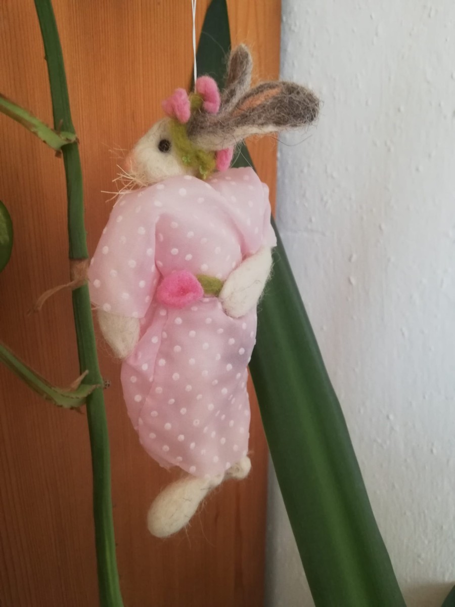 Monica ist aus Salzburger Bergschafwolle handgefilzt. Sie hat schickes Kleid aus Upcyclingstoff an. Sie ist eine besondere Dekoration für jede Osterdekoration und zum Aufhängen. Ca. 16 cm groß.