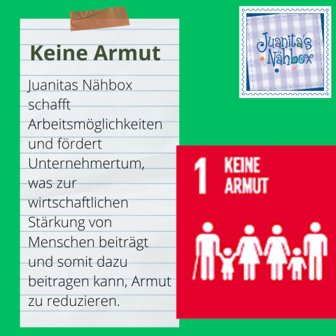 1. **Keine Armut (SDG 1)**: Juanitas Nähbox schafft Arbeitsmöglichkeiten und fördert Unternehmertum, was zur wirtschaftlichen Stärkung von Menschen beiträgt und somit dazu beitragen kann, Armut zu reduzieren.