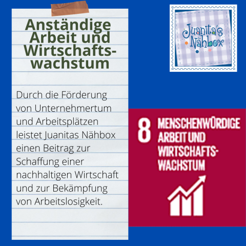 6. **Anständige Arbeit und Wirtschaftswachstum (SDG 8)**: Durch die Förderung von Unternehmertum und Arbeitsplätzen leistet Juanitas Nähbox einen Beitrag zur Schaffung einer nachhaltigen Wirtschaft und zur Bekämpfung von Arbeitslosigkeit.