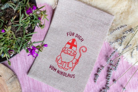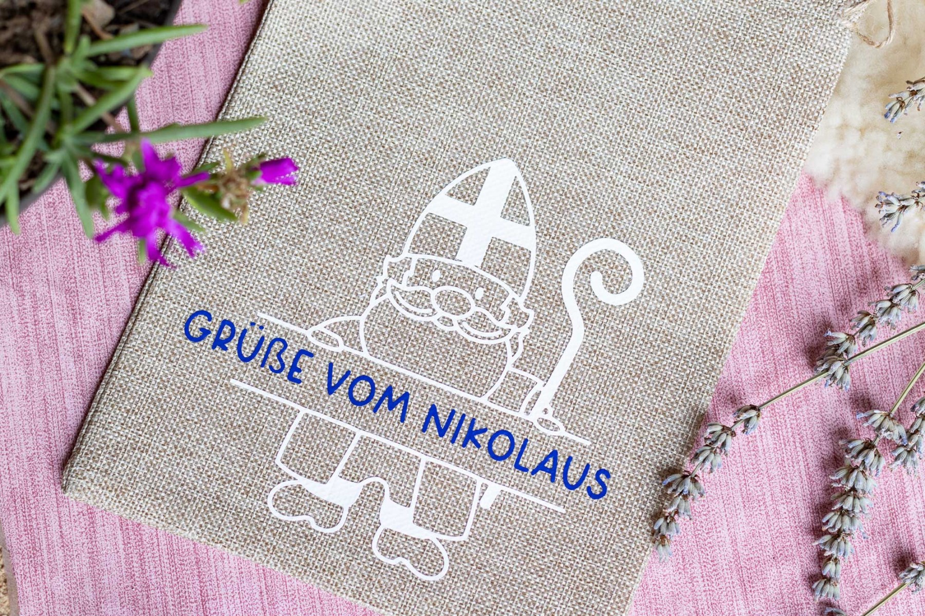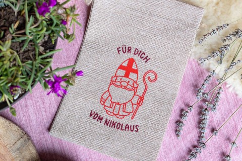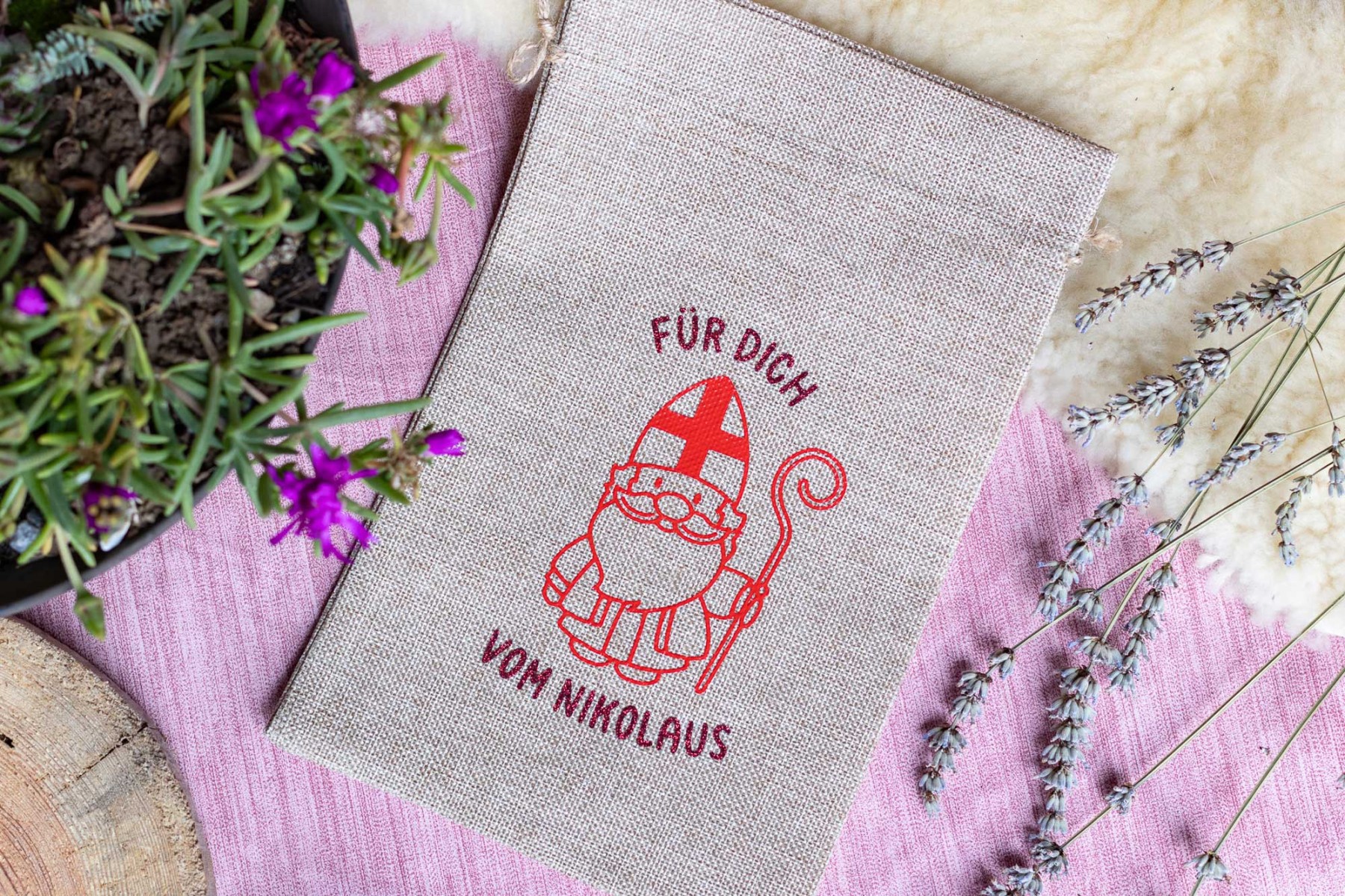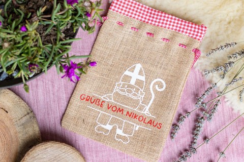 Unsere selbstbedruckten Jute-Geschenkssackerl, mit praktischem Schnürlzug, sind ideal um ein kleines „Geschenk vom Nikolaus“ zu verpacken.