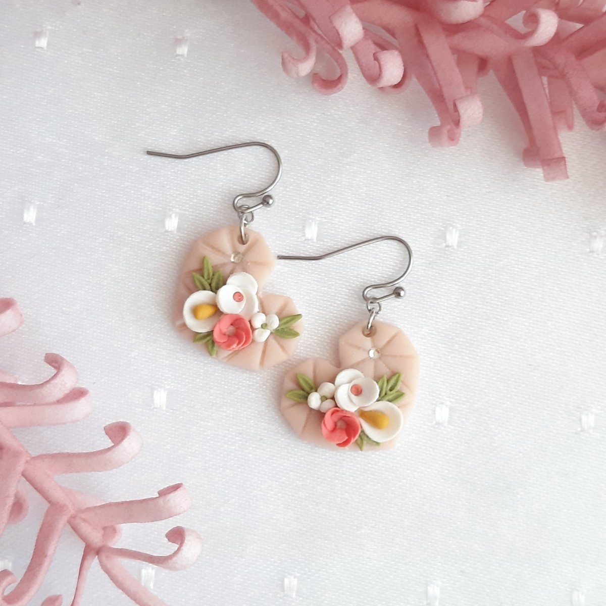 Handgemachte Ohrringe aus federleichtem Polymerton. Alle Blumen und Blätter wurden einzeln und von Hand modelliert. Ohrhaken aus Edelstahl.