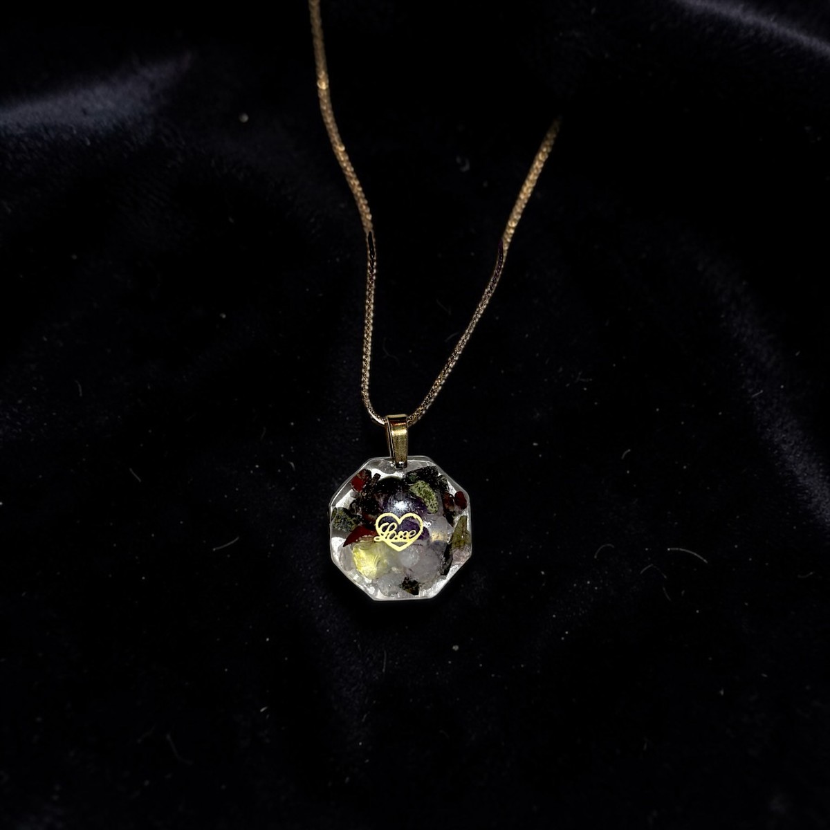Dieser Orgonit vereint die Energie von Amethyst, Drachenblut, Obsidian, Aquamarin, Rosenquarz und Citrin