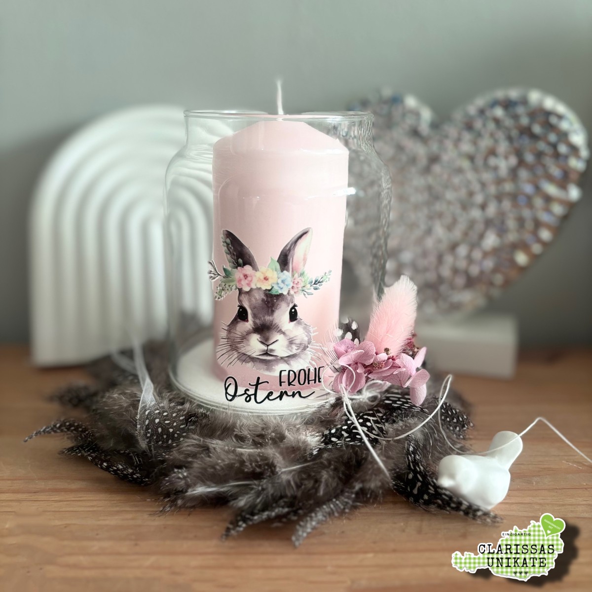 Liebevolles Osterwindlichtglas mit Kerze, Streusand, Federnkranz und aus Raysin gegossenem Spatz.