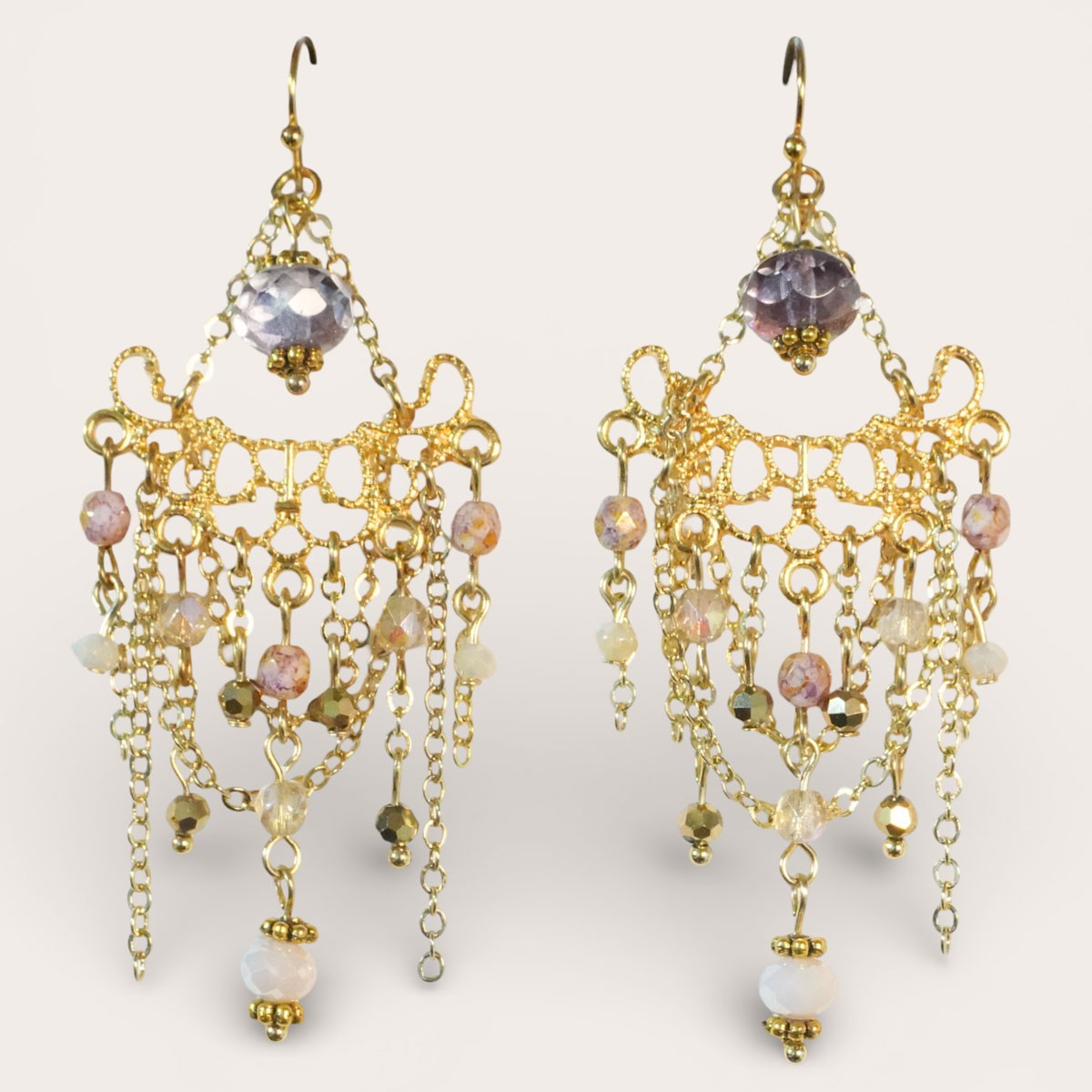 Handgemachte Chandelier Ohrringe, elegant, romantisch & wunderbar glänzend. Glasperlen in Weiß/Gold und Rosa Farbentönen mit hellen Akzenten. Je nach Lichteinfall glitzert es mal da mal dort und die Perlen erscheinen in einer dezent anderen Farbnuance.