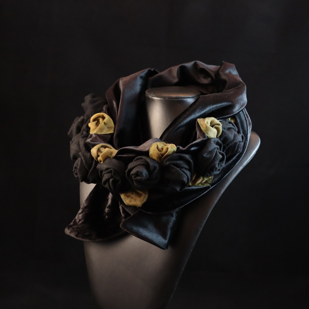 In meiner Arbeit vereine ich verschiedenste Materialien wie Halbedelsteine, Samt, Seide und Stoffe zu außergewöhnlichen und immer einzigartigen Kunstwerken. Neben Schals und Tüchern entstehen so auch Handtaschen, Jacken, Röcke, Broschen und Armbänder.