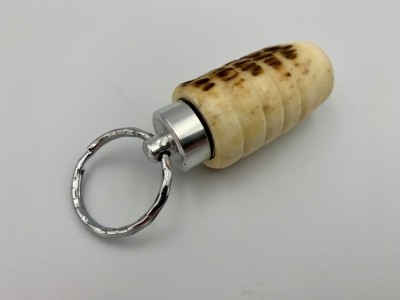 Schlüsselanhänger mit Wasserdichtem Geheimfach, bietet Platz für kleine Dinge wie z. B. Allergiepillen die man immer dabei haben sollte, gedrechselt aus Hirschhorn mit Alu. Gesamtlänge ca. 8,0 cm.