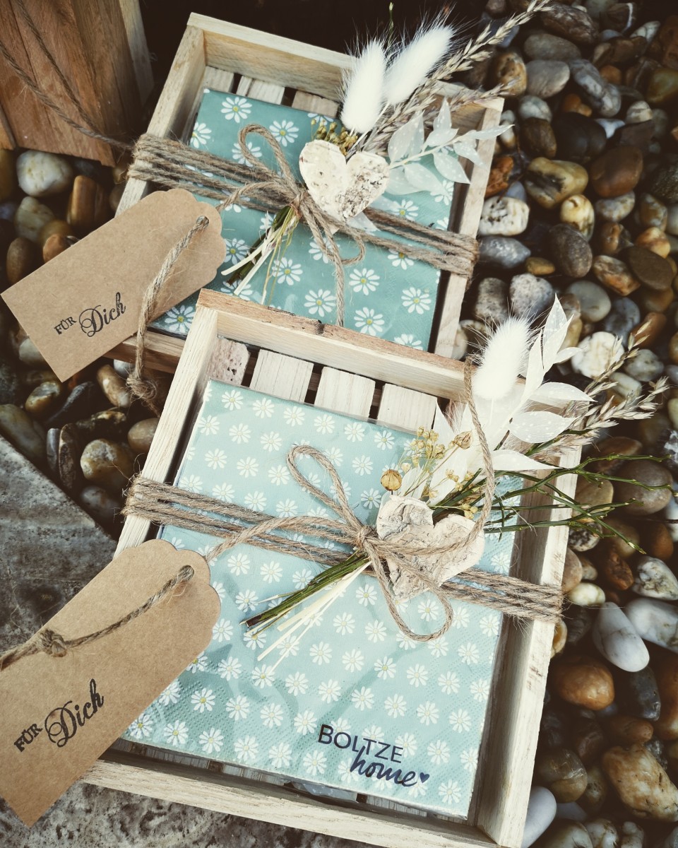 Serviettenhalter aus Holz gefertigt mit Cocktailservietten und Trockenblumen dekoriert. Nachhaltiges liebevoll gestaltetes Geschenk für jeden der es etwas rustikaler mag.