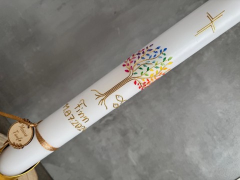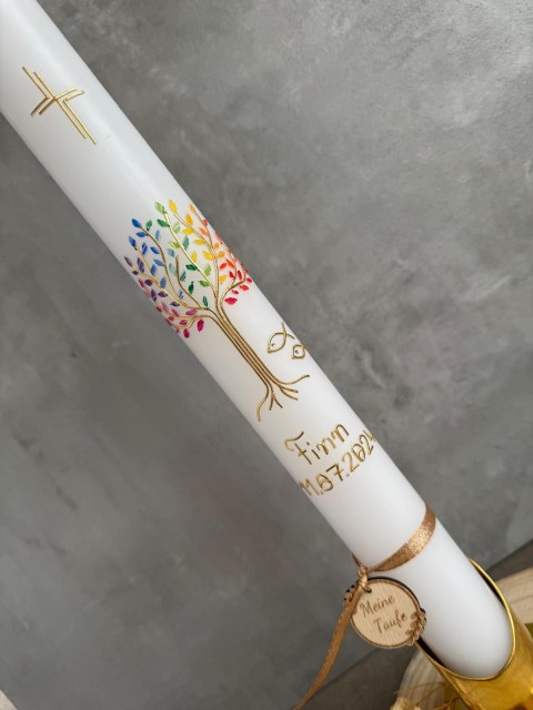 Schöne Taufkerze mit bunten Lebensbaum und kleinen Fischen. Name des Täuflings und Datum ergänzen das elegante Design, das Wachstum, Schutz und Segen symbolisiert. Inklusive kleinen Holzanhänger.