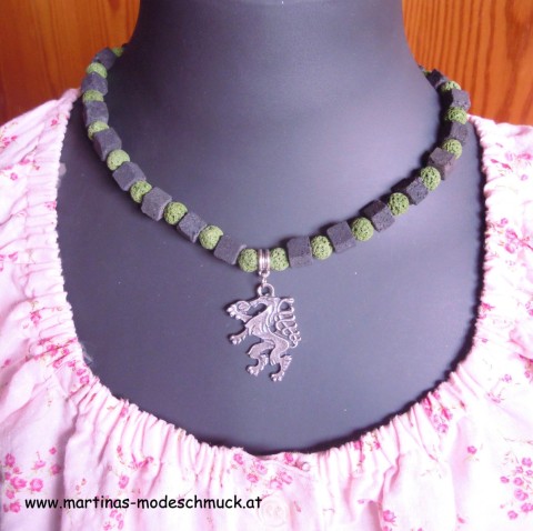 Trendiges Trachtenset aus echtem Lavastein - kombiniert aus schwarzen Würfeln und grünen Kugeln mit einem wunderschönen Panther Anhänger.
