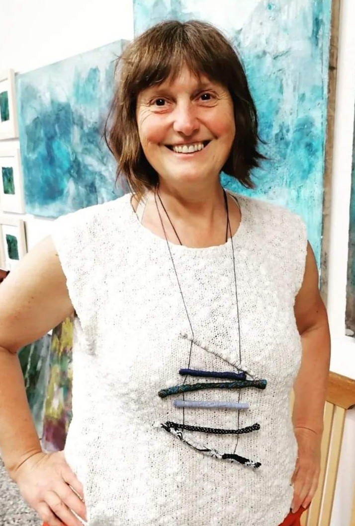 Die Rollen sind aus Stoff, mit Nähseide umwickelt und auf einen Baumwollfaden aufgefädelt. Stoffe, Muster und Farben variieren