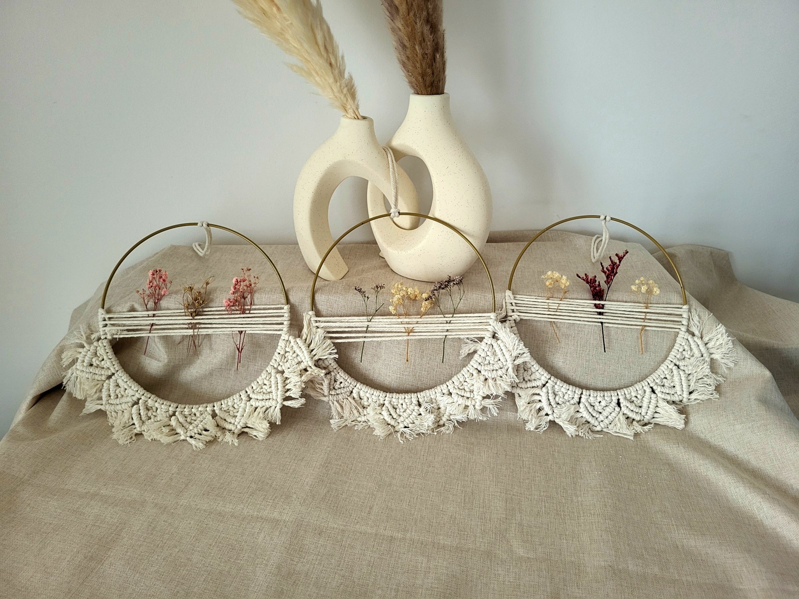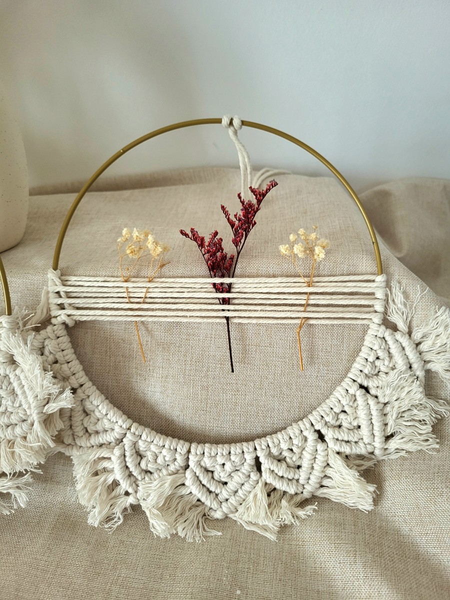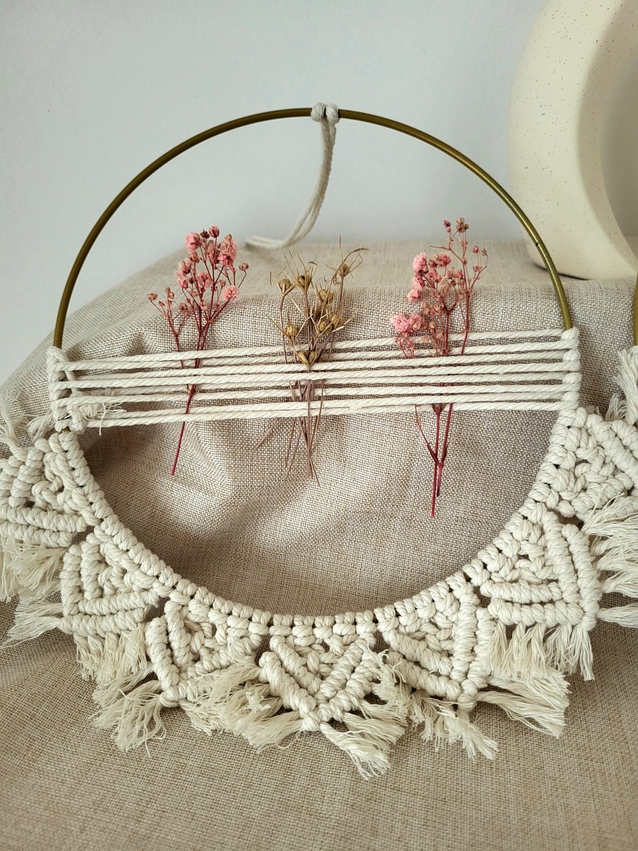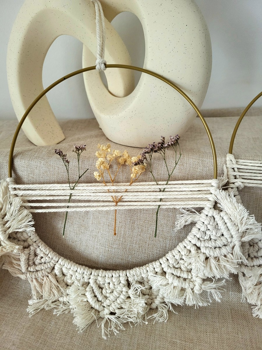 Handgefertigter Trockenblumenkranz im Makramee-Stil aus 100 % Baumwollgarn. Natürliche Materialien und zarte Trockenblumen machen ihn zu einem zeitlosen Deko-Highlight für dein Zuhause.