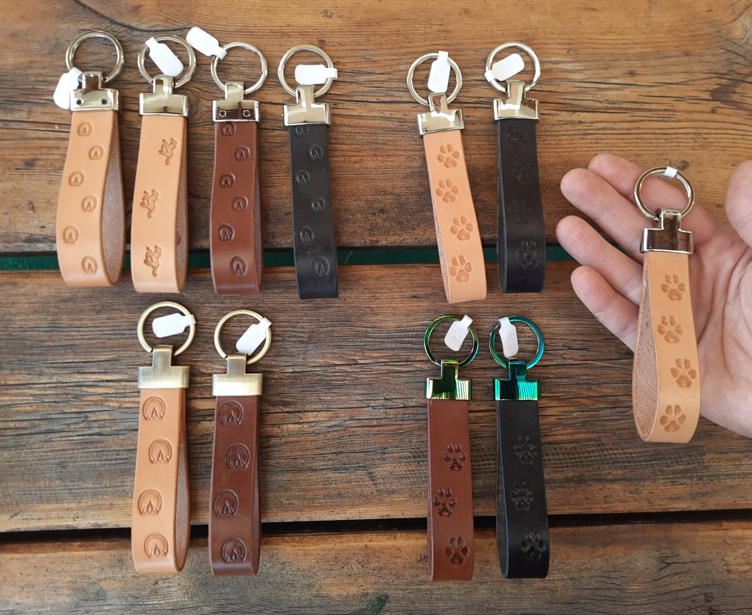 pflanzlich gegerbtes Leder, punziert mit Hundepfoten oder Hufen, mit massivem Schlüsselringanhänger, silber, antikmessing, schwarz (€ 8.- + V.) oder regenbogen (€ 9.- + V.)