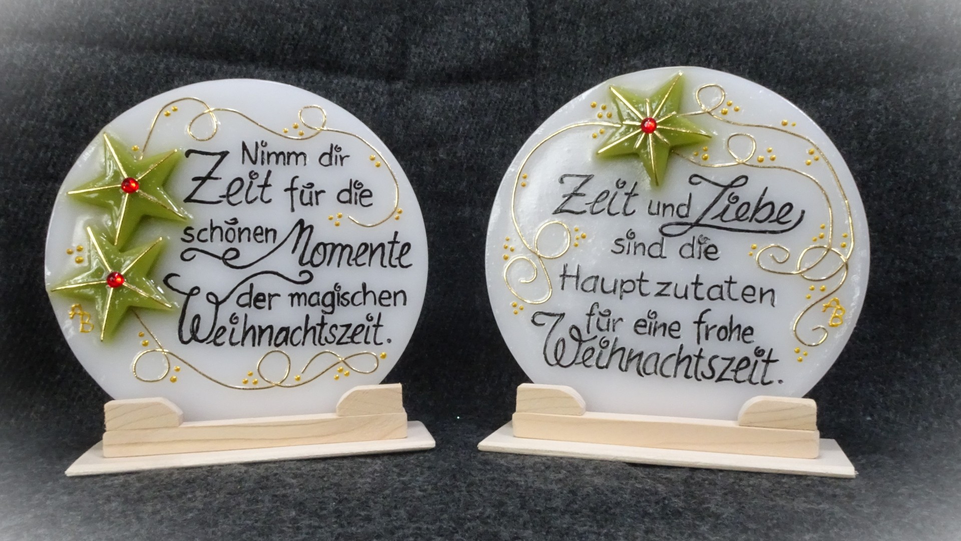 Wachsplatten, gegossen aus alten Kerzen, werden mit Verzierwachs liebevoll nach Ihren Wünschen gestaltet.