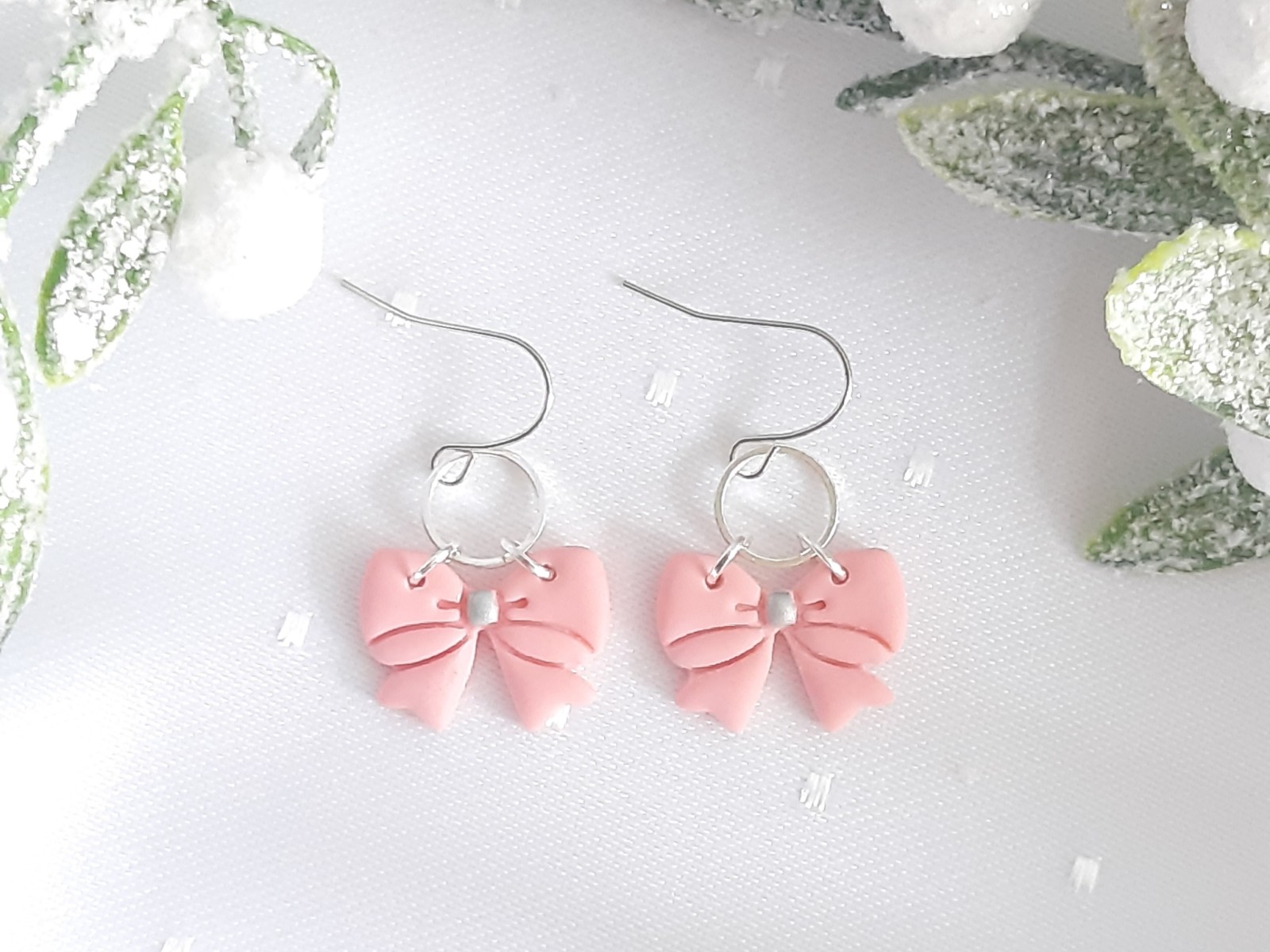 Winterliche Ohrringe mit rosa Schleife und silberfarbenen Elementen. Die Schleife wurde aus Polymer Clay gefertigt. Der angebrachte Ohrhaken ist aus Edelstahl.